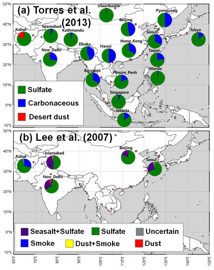 Aerosol-type classifications for Asian capital cities from threshold-based satellite models [27,28] are shown in Figure 4 (with >200 classifications). Aerosol types were classified into three types (sulfate, carbonaceous, and desert dust) by Torres et al. [27] in 18 capital cities (Figure 4a) and classified into six types (smoke, sulfate, dust, sea salt and sulfate, dust and smoke, and uncertain) by Lee et al. [26] for Beijing, Seoul, Islamabad, Kabul, and New Delhi (Figure 4b). In general, both satellite models also detected non-absorbing aerosols with high occurrence rates in all capital cities. There were high contributions of carbonaceous aerosol (strongly absorbing fine mode aerosol) detected by Torres et al. [27] in Pyongyang (49%), Dhaka (44%), and Beijing (46%). Moreover, the contribution of carbonaceous aerosol detected by Torres et al. [27] was found to be similar to the AERONET-based aerosol type (Figure 3b) in Dhaka and Taipei. Torres et al. [27] also detected dust aerosol with a maximum occurrence rate (20%) in Kabul among other capital cities while Lee et al. [26] classified smoke (strongly absorbing fine mode aerosol) aerosol in Kabul with a high occurrence rate of 29%.