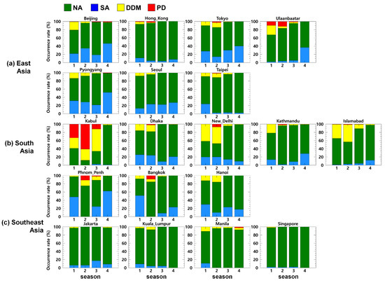 The aerosol-type occurrence rate was calculated seasonally in the capital cities of East Asia, South Asia, and Southeast Asia (Figure 5). For the seasonal variation, four seasons were labeled as season 1, season 2, season 3, and season 4, respectively, because there are different ways to divide the four seasons: South Asia and Southeast Asia (pre-monsoon, monsoon, post-monsoon, and winter), East Asia (spring, summer, autumn, and winter). As reported in earlier study [22], pollution particles (NA and SA) are predominant in East Asia with the NA type occurring frequently throughout all seasons, and NA being the most prevalent in Hong Kong and Taipei, possibly due to large contributions of maritime aerosol, which is strongly light-scattering and highly hygroscopic (Figure 5a). Contributions of the SA type usually peak in season 4 (winter), likely due to increased coal combustion for domestic heating [22]. Over East Asia, the DDM and PD types are usually more prevalent in season 1 (March–May, spring), especially in Ulaanbaatar where the occurrence rate of pure dust and dust mixed with pollution aerosols (PD and DDM) peaked at 32%. Contributions of PD were <3% in capital cities except for Ulaanbaatar (12%) near desert regions. Besides Ulaanbaatar, a higher DDM (20%) type was detected in Beijing in season 1 (March–May, spring) due to the Yellow wind phenomenon in the area [57]. Seasonal aerosol-type occurrence rates in South Asia are shown in Figure 5b. Overall, there were fewer SA and more DDM and PD detections than in East Asia. Dust-containing (DDM and PD) aerosols were usually detected from season 1 to season 2 (March–August, spring–summer). As reported in previous studies, dust aerosols are usually transported during the pre-monsoon (season 1) and South Asian monsoon (season 2) [64,65]. Dust-dominated aerosols were more frequently identified in Kabul than in other capital cities during season 1–season 3 (March–November), with a PD contribution of >50% in season 2 (June–August, South Asian monsoon), likely due to the effect of desert regions [64,65]. From season 3 to season 4 (September–February), contributions of dust aerosol were significantly lower than those of pollution aerosol (SA and NA). In Southeast Asia (Figure 5c) overall, the contribution of NA was predominant, possibly due to maritime aerosols, as these cities are located near the coast. The NA type includes both anthropogenic and marine aerosols [20]. In capital cities of the Indo-china Peninsula (Phnom Penh, Bangkok, and Hanoi), contributions of SA were generally at their maximum in season 1 (March–May, pre-monsoon) and minimum in season 2 (June–August, Southeast Asian monsoon) due to the seasonality of biomass burning activity as reported in previous studies [66,67]. There was negligible seasonality in Jakarta, Kuala Lumpur, Manila, and Singapore with an average proportion of NA of 98%.