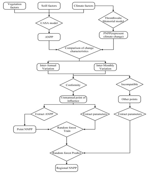 The climate factors used for estimating PNPP are precipitation and temperature in the climatological model. Therefore, the PNPP was regarded as a comprehensive indicator of multiple climatic factors, and changes in PNPP represent the climate change. Theoretically, if there were only effects of climate change, the changing patterns of vegetation NPP should be consistent with the climate, and the ANPP of the corresponding grid is NNPP. Based on this hypothesis, we extracted grid without human activities by determining whether the ANPP changing trends of the grassland vegetation were consistent with the climate change. The actual NPP with unmanned influence point is defined as NNPP, and the parameters of this grid are trained using the random forest learning algorithm, and finally the NNPP values at the grid scale were upscaled to the entire area (Figure 2).