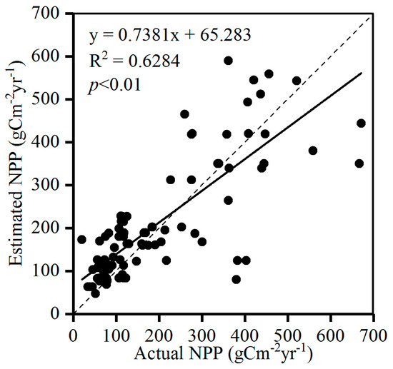 The measured NPP values were derived from field sampling (n = 27) and literatures (n = 71) [20,21]. During field sampling, the grass plot was 25 m × 25 m, and three plots of 30 cm × 30 cm were selected on the diagonal. The above-ground biomass was harvested, the roots were dug out, and the sample was dried (85 °C). After reaching a constant weight, the dry mass was weighed to obtain biomass, and the dry weight was multiplied the conversion coefficient by 0.475 to obtain the NPP [22].