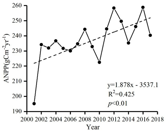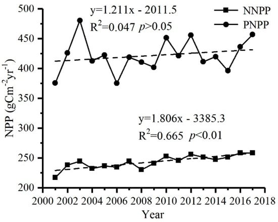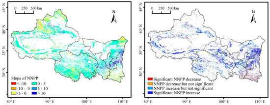 Based on the RF machine learning algorithm, the ANPP in the non-human affected grids were upscaled to the entire area to obtain NNPP (Figure 8a). The multi-year average value was 243.60 gC·m−2·yr−1 and an annual total of 276.75 TgC·yr−1. The high value of NNPP was mainly distributed in the southern Shaanxi, the southeastern Qinghai, and the northwestern Xinjiang. The average annual NNPP showed an increasing trend at a rate of 1.81 gC·m−2·yr−1 (Figure 9). From 2001 to 2017, 80.81% of the grassland NNPP showed an increasing trend (Figure 10). Among them, the areas with a significant increase accounted for 34.11%, mainly in the north regions of Shaanxi, middle of Gansu and Qinghai. However, 19.19% of the grassland showed a decreasing trend in the NNPP, and only 1.86% showed a significant decreasing trend, mainly in the southern Shaanxi Province.