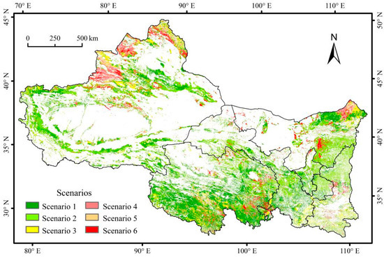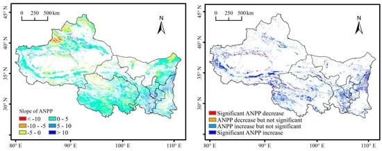 The spatial distribution of grassland ANPP change, including climate variation, human activities, and combined effects of climate variation and human activities during the 2001–2017 were analyzed (Table 1 and Figure 14). In order to disentangle the relative effects of human activities and climate change in the process of grassland change, six possible scenarios were defined (Table 1) and evaluated by calculating the Slope of ANPP, NNPP, and HNPP_N.