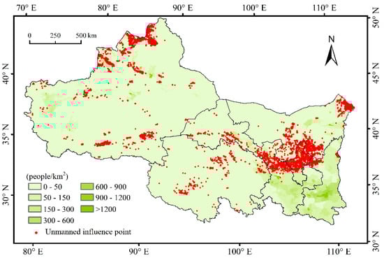 The population density in the study area is shown as Figure 7, and the most of the unmanned influence points are distributed in areas with low population density. A total of 10,231 non-human affected grids were extracted (Figure 7). Unmanned influence points are mainly distributed in uninhabited areas such as plateaus, mountains, and deserts. Most of these places are far away from strong human activities areas such as cities and towns, located in nature reserves and ANPP low-value areas.