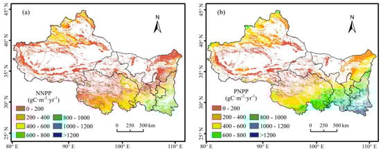 Spatial distribution of annual mean NNPP (a) and PNPP (b) during 2001–2017.