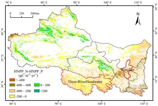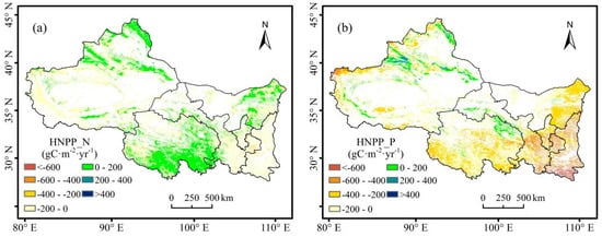 The mean values of HNPP_N and HNPP_P were −7.45 gC·m−2·yr−1 and −189.15 gC·m−2·yr−1, accounting for 3.14% and 79.81% of ANPP, respectively. The former showed that human activities had weak negative effects, and the latter indicated strong negative effects. The spatial pattern of HNPP also showed great differences (Figure 16).