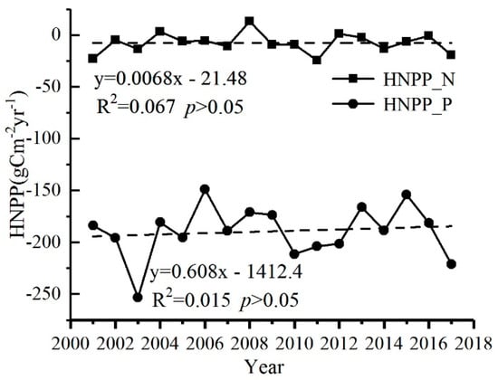 Changes in the annual average values of HNPP_N and HNPP_P from 2001 to 2017.