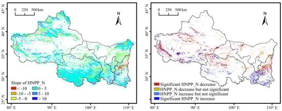 In this study, the changing direction and trends of HNPP are defined based on the values of HNPP and Slope. When HNPP and slope values are positive, it indicates that the positive influence of human activities on NPP is increasing. Slope value is negative, it indicates that the positive influence is decreasing. When HNPP and Slope values are negative, it indicates that the negative influence of human activities on NPP is increasing. When the slope value is positive, it indicates that the negative influence is decreasing.