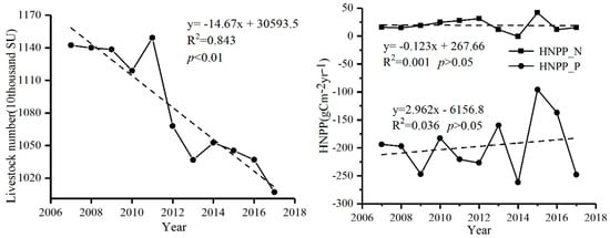 The HNPP_N > 0 (24.068 gC·m−2·yr−1) and HNPP_P < 0 (−197.120 gC·m−2·yr−1) in the Three-River Source Region (Figure 11), where the main human activity is grazing. Since 2003, the “Animal Reduction Project” has been implemented in the Three-River Source Region. By 2015, the stocking pressure index has decreased by 34.3% [36]. According to the statistical data from 2007 to 2017, and the inventory showed a significant decline of 146,700 stock unit (SU) per year (Figure 17). The livestock reduction project has achieved significant result [3]. In addition to livestock reduction measures, the Three-River Source region has implemented a series of ecological restoration measures, such as grass fences, artificial replanting of grass seeds, artificial rainfall, and rodent control. The total area of returning farmland to forest and grassland is approximately 102.07 km2 [33], and comprehensive management of 3.49 × 107 km2 was implemented for improve grassland yield, forage quality, disaster resistance, and species diversity [3]. Therefore, the human activities in this area had a positive effect on grassland, indicating that the HNPP_N results were more accurate.