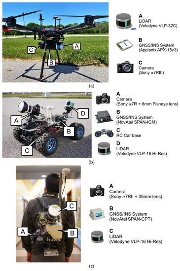 A total of six mobile mapping systems are used in this study: an unmanned aerial vehicle (UAV), an unmanned ground vehicle (UGV), a backpack-mounted portable system (hereafter called Backpack), the portable system mounted on a carrier vehicle (hereafter called Mobile-pack), a medium-grade wheel-based system: Purdue wheel-based mobile mapping system—high accuracy (PWMMS-HA), and a high-grade wheel-based system: Purdue wheel-based mobile mapping system—ultra-high accuracy (PWMMS-UHA). All the six MLMS units utilize direct georeferencing, i.e., the position and orientation information of the onboard sensors are directly obtained by an integrated global navigation satellite systems/inertial navigation systems (GNSS/INS). Figure 1 shows the six MLMS units together with the onboard sensors. Table 1 lists the specifications of the georeferencing [45,46,47,48,49] and LiDAR units [50,51,52,53,54] for each MLMS including the approximate total cost of the equipment.