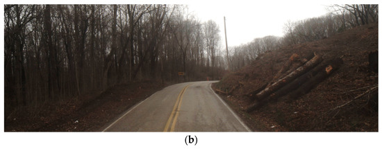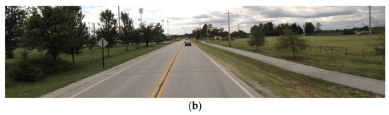 Datasets A-1, A-2, and A-3 were collected over a county road, CR500N, in Indiana, USA. An aerial photo of the study site is presented in Figure 2a, and an image capturing location PA1 taken by the front left camera on the PWMMS-HA is shown in Figure 2b. This study site is located at a densely vegetated hill, as can be seen from the aerial photo. The average slope along the road is 6% (approximately 20 m elevation change over a planimetric distance of 350 m). The roadside ditches are present on both sides of the road and covered by short vegetation. At the time of this data acquisition, the indicated study site was being reworked to change the S-curve of the road to a simple curve with the goal of improving traffic safety. Cut trees for the road rework can be seen on the right side in Figure 2b. The PWMMS-HA and Mobile-pack drove along the road in both directions. The UAV was flown in four tracks over the study site with a flying height of 50 m above ground and a lateral distance of 14 m between neighboring flight lines.