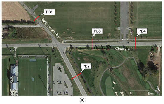 Datasets B-1 to B-5 were collected at the intersection of McCormick Road and Cherry Lane adjacent to Purdue University’s campus in West Lafayette, Indiana, USA. The roadside ditches are present on both sides of the road and are covered by short vegetation. The width of these ditches ranges from 2 to 10 m, and their depth ranges from 0.2 to 1 m. Figure 3 shows an aerial photo of the study site and an image capturing location PB3 taken by the front left camera on the PWMMS-HA. To evaluate the absolute accuracy of the LiDAR-based mapping of the ditches, an RTK-GNSS survey was carried out at four cross-section locations—PB1, PB2, PB3, and PB4 in Figure 3a. For each profile, the team surveyed few points on the road and 20 to 25 points across the ditch. The team also took few measurements on the sidewalk that was adjacent to the road in profiles PB3 and PB4. The PWMMS-HA, PWMMS-UHA, UGV, and Backpack data were acquired on the same date when the RTK-GNSS survey was conducted. The PWMMS-HA and PWMMS-UHA covered all routes in both directions, so both datasets have two tracks. The UGV and Backpack acquired data along the ditches on both sides of the road in forward and backward directions, resulting in four tracks over the surveyed area. The Mobile-pack data was acquired at a later date (approximately three months from the RTK-GNSS and other MLMS surveys, refer to Table 4). The system drove along Cherry Lane and the south part of McCormick Road in both directions. Location PB1 was not covered in this survey.