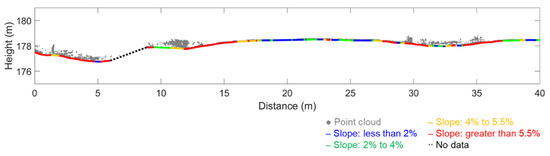 A cross-sectional profile with a given length and width can be extracted from the point cloud, bare earth point cloud, and/or DTM at any location. The orientation of the profile should be perpendicular to the direction of the road, which can be derived using the vehicle trajectory information. Once the profile is extracted, the slope along the profile is evaluated using the bare earth points; a sample result is shown in Figure 7. The profile and slope information extracted from LiDAR data can then be compared to the design/standard values [62] to detect problems such as improper grade. Furthermore, using the trajectory information, it is possible to crop and analyze a series of cross-sectional profiles automatically based on a user-defined interval.