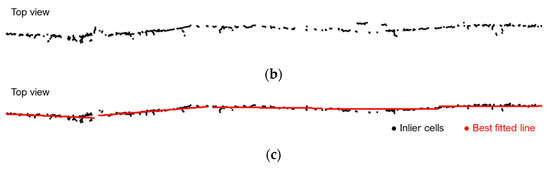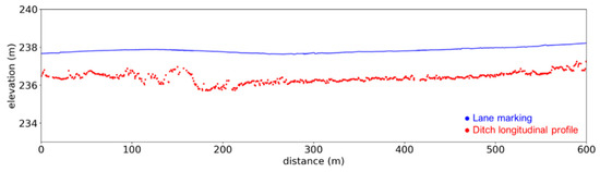 A longitudinal profile is the one along the “valley” of a ditch; that is, it aligns with the major stream in the drainage network. Figure 8a shows an example of the drainage network extracted from MLMS data, from which some tributaries and discontinuities along the major streams can be observed. To identify the location of the longitudinal profile, we need to remove tributaries and connect major streams. Since our focus is the ditches adjacent to a transportation corridor, the drainage network is expected to be a long, linear feature. Line fitting is performed to estimate the line parameters, which, in turn, are used to find the direction of the major stream. The drainage network is then rotated so that the direction of the major stream is along the X-direction. The tributaries are removed based on the assumption that within a small range of the X-coordinate of the rotated drainage network, the elevation of the major stream is lower than the elevation of the tributaries. A sample result is shown in Figure 8b. Next, we divide the streamlines into segments and apply line fitting and outlier removal using a random sample consensus (RANSAC) strategy [64], depicted in Figure 8c, assuming that the ditch line is approximately a straight line within each segment. The longitudinal profile is extracted based on the location of the inlier streamlines and best-fitted lines. Figure 9 illustrates a sample longitudinal profile together with the detected lane marking that signifies the elevation of the road surface.