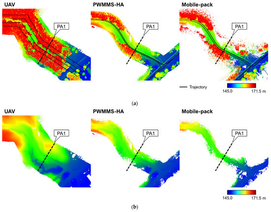 MLMS mapping products showing the (a) point cloud and trajectory and (b) bare earth point cloud from UAV, PWMMS-HA, and Mobile-pack.