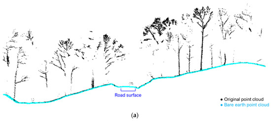 The point cloud and bare earth point cloud were first generated from each dataset. Figure 10a shows the point clouds from different MLMS units together with the trajectory. While the ground MLMS units can only drive on road, and therefore the point cloud coverage is limited to areas adjacent to the road, theoretically, there is no such limitation on the flight movement for the UAV. For the datasets used in the current analysis, the UAV was able to maneuver over a large area and obtain a wide spatial coverage. The bare earth point clouds were extracted using the modified cloth simulation approach, and the results are depicted in Figure 10b. A cross-sectional profile at location PA1 was extracted from the original and bare earth point clouds. The profile side view, as shown in Figure 11, demonstrates that the LiDAR points were able to penetrate the vegetation and capture the terrain. Compared to the UAV, the ground systems are more prone to occlusions caused by terrain features. Having said that, all three systems show complete coverage over the road surface and ditches, which are the focus of this study.