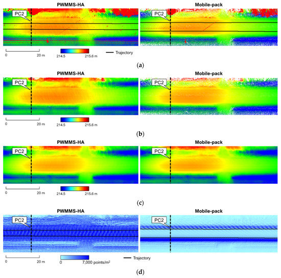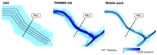Point density of the bare earth point cloud along with the trajectory from UAV, PWMMS-HA, and Mobile-pack.