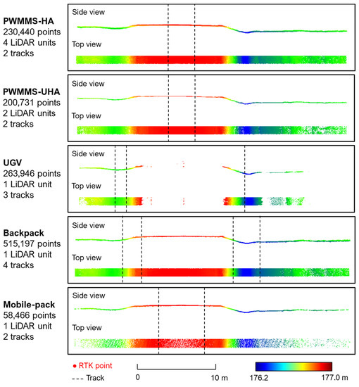 The discussion above reveals that all the MLMS units can achieve similar mapping accuracy. The advantage of UAV is that it can maneuver over areas that are difficult to reach by ground vehicles. Nonetheless, field surveys with ground MLMS units are more efficient since the vehicles can travel at a higher speed and cover a longer extent. As long as the ROI is limited to areas adjacent to the road, all the MLMS data can have full coverage with a decent point density, which is adequate for monitoring roadside ditches.