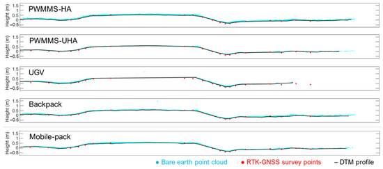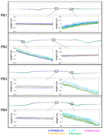 Upon reconstructing the point cloud, the bare earth point cloud was extracted, and the DTM was generated using the modified cloth simulation approach for each dataset. Cross-sectional profiles at locations PB1, PB2, PB3, and PB4 were extracted from the point cloud, bare earth point cloud, and DTM with a width of 1 m. Figure 13 shows the cross-sectional profiles of the bare earth point clouds from different MLMS units at location PB3. The spatial coverage of point clouds from different systems was evaluated qualitatively. As can be observed in Figure 13, with sufficient number of tracks, each of the mobile mapping systems demonstrates a complete coverage of the ditch. The UGV point cloud, despite having full coverage over the ditches, has limited coverage of the road and areas that are away from the tracks. For the UGV, the location of tracks with respect to the ditch plays a crucial role. Since the UGV tends to be very close to the ground, it is prone to occlusions caused by surrounding vegetation and terrain. The Mobile-pack has the least number of points because it has only one LiDAR unit covering two tracks over the region of interest, and the vehicle to which the sensor assembly was mounted traveled at a speed similar to that of the PWMMS-HA and PWMMS-UHA. One thing to note is that the point density of Mobile-pack drops rapidly when moving away from the trajectory. This is attributed to the mounting orientation of its LiDAR sensor whose field of view was limited to focus on objects in short range (refer to Figure 1d and the discussion in Section 3.1). Figure 14 shows the side view of the cross-sectional profiles at locations PB1, PB2, PB3, and PB4 from the bare earth point cloud. Qualitatively, point clouds from different MLMS units are aligned well along the vertical direction. Over the ditch areas, the noise level of the point clouds is higher due to different degrees of penetration on vegetation.