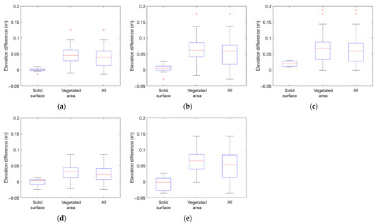 The absolute accuracy is assessed against manually collected RTK-GNSS measurements (hereafter, RTK points). To investigate the LiDAR mapping accuracy over different surfaces, we manually classify the LiDAR/RTK points into two classes: solid surface (including road and sidewalk) and vegetated area. The elevation difference between each RTK point and its closest LiDAR point is calculated, and the root–mean–square error (RMSE) and interquartile range are reported for each class.