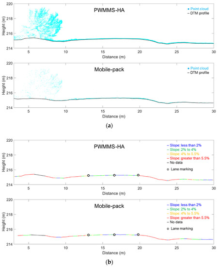 Cross-sectional profiles shown in 3D (side view and colored by slope) and the images from (a) PWMMS-HA and (b) Mobile-pack.