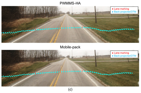 The raw data collected by various MLMS units includes LiDAR range and intensity measurements, camera images, and georeferencing information from the GNSS/INS unit. In order to reconstruct accurately georeferenced and well-registered point cloud as well as to integrate the information from cameras, a system calibration procedure that estimates the relative position and orientation (hereafter, denoted as mounting parameters) between the LiDAR and imaging sensors and the GNSS/INS unit is required. The mounting parameters in this study are accurately estimated using the in-situ calibration procedure proposed by Ravi et al. [55]. This procedure estimates the mounting parameters by minimizing discrepancies among conjugate points, linear features, and/or planar features obtained from different LiDAR units and cameras in different drive-runs/flight lines. Table 2 shows the range of standard deviation of estimated mounting parameters for all LiDAR units/cameras onboard each MLMS from the system calibration. The lever arm component along the Z direction () was determined by incorporating real-time kinematic global navigation satellite systems (RTK-GNSS) survey measurements in the calibration model as vertical control. The accuracy of the final ground coordinates for each MLMS at a specified sensor-to-object distance was evaluated using the LiDAR Error Propagation calculator developed by Habib et al. [56]. The results, as shown in Table 3, indicate that an accuracy of under 5–6 cm is achievable from all systems.