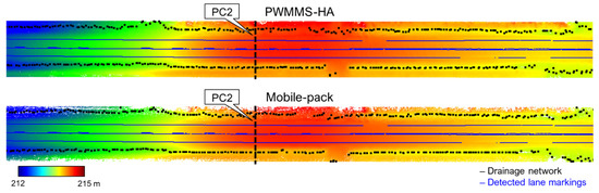 In this section, the performance of PWMMS-HA and Mobile-pack for roadside ditch characterization was evaluated. The advantage of PWMMS-HA is that the point cloud has a more uniform density and a larger coverage (up to 20 m from the road edge). That is, in addition to the roadside ditches, the PWMMS-HA point cloud can provide information on the areas adjacent to the ditches. Such information is helpful for investigating the causes of local flooding. Nevertheless, both PWMMS-HA and Mobile-pack point clouds have adequate spatial coverage for ditch line characterization. The cross-sectional profiles, drainage network, and longitudinal profiles extracted from both MLMS units are shown to be compatible.