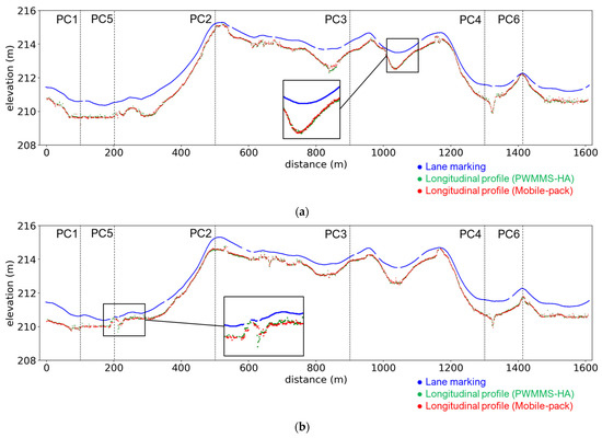 Longitudinal profiles from PWMMS-HA and Mobile-pack data together with the detected lane marking showing: (a) the ditch and road edge line on the left and (b) the ditch and road edge line on the right when driving eastbound.