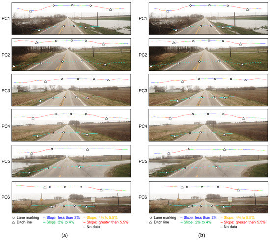 The strength of MLMS units for characterizing roadside ditches lies in the ability to (i) visualize the profiles in 3D point clouds as well as 2D images, and (ii) incorporate other information derived from MLMS data (for example, the detected lane markings). Such capability leads to a thorough understanding of roadside drainage conditions, which is the key to prioritizing and planning maintenance. In addition, with the proposed ditch line characterization approach, the relatively low-cost system (Mobile-pack) can achieve similar performance as compared to PWMMS-HA.