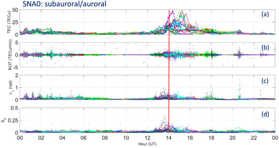 The SNA0 receiver recorded TEC increases (Figure 2a) during the nighttime (00:00–04:00 UT), in the early afternoon (12:00–17:00 UT), around 18:00 UT and between 20:00 and 21:00 UT. Such increases were characterized by rapid TEC fluctuations, as demonstrated by ROT data (Figure 2b), and associated with moderate/strong phase fluctuations (Figure 2c) with low or no amplitude scintillations, except between 12:00 and 16:00 UT when SNA0 recorded moderate amplitude scintillations (S4 ~0.4, Figure 2d) affecting several satellites in view. We recall that, according to Alfonsi et al. [8], a scintillation event is considered of moderate to intense level when S4 and σφ are both greater than 0.25, while scintillation is considered to be weak when S4 and σφ are both between 0.1 and 0.25. In addition, only when both S4 and σφ simultaneously exceed 0.25 the scintillation is actually occurring (see, e.g., References [27,29]).