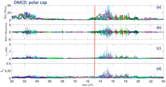 Figure 2 and Figure 3 show TEC (a), ROT (b), σφ (c) and S4 (d) time profiles recorded on 8 September 2017, by the GNSS receivers SNA0 and DMC0 located at SANAE IV and Concordia stations, respectively. Different colors refer to different satellites entering the receivers’ fields of view. For both GNSS stations, TEC data (panels a in Figure 2 and Figure 3) show profiles that deviated from the quiet time diurnal variation, which typically maximize in the local noon/post noon sector (around 12:00 UT for the SNA0 receiver and around 08:00 UT for the DMC0 receiver). The increase of TEC was characterized by values much higher than expected for quiet times, which usually do not exceed 20 TECu (Total Electron Content unit, 1 TECu = 1016 el m–2, e.g., References [46,57]).