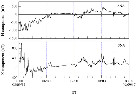 H and Z magnetic field components recorded at SNA magnetic station located in SANAE IV base on 8 September 2017.