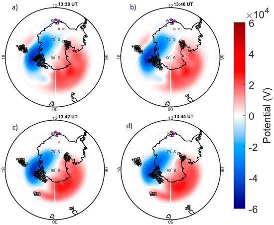 Polar-view maps in AACGM latitude and MLT of SuperDARN observations at 13:38 UT (a), 13:40 UT (b), 13:42 UT (c) and 13:44 UT (d) on 8 September 2017. Each map shows the isocontours of the ionospheric potential (red=positive, blue=negative potential) and SuperDARN measurements (black squares) recorded in the two minutes following the time shown at the top of each map. In each map the projection to 350 km of altitude of all the σφ values recorded by SNA0, with elevation angle α = 30° (purple circles), in the same time interval as for SuperDARN observations are also shown. In each map, which covers 00:00–24:00 MLT and |50°|–|90°| AACGM Lat, the magnetic noon/midnight is at the top/bottom.