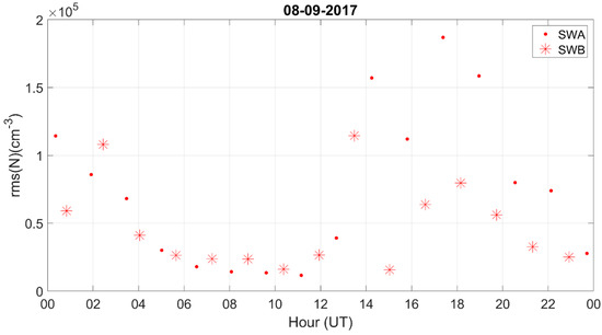 Electron density root mean square (rms) by Swarm A (dots) and Swarm B (stars) on 8 September 2017, in the Southern Hemisphere. The AACGM latitude ranges between 70° and 90° S.