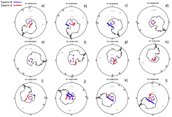 In fact, contrary to the case of the GNSS receiver located at SANAE IV base, whose field of view looks at latitudes not covered by the PCP flag, at the magnetic latitudes covered by the receiver’s field of view at Concordia we can take advantage of the information provided by this index. Figure 10 shows the PCP flag estimated by Swarm A (red) and Swarm B (blue) measurements. Specifically, each map displays PCP flag values different from zero (i.e., presence of polar cap patches), collected by both Swarm satellites in the time interval shown on the top of each panel, and the projection to 350 km of altitude of all the concurring σφ values having elevation angle α = 30° (purple circles) recorded by the GNSS receiver at Concordia. This enables a comparative investigation between the occurrences of patches and GNSS scintillation. The comparison between maps in Figure 10 and the Bz,IMF trend (red curve in panel a of Figure 1) shows that during southward Bz,IMF the values of the PCP flag confirm the presence of patches. In addition, Figure 10 shows that Swarm satellites detected patches both close to and inside the GNSS field of view during scintillation events (see panels c and d of Figure 3), thus suggesting that PCP could have caused the corruption of the corresponding GNSS signals [11,13].