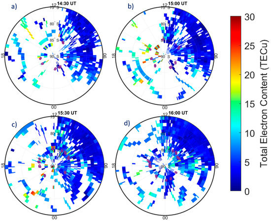 Polar-view maps in AACGM latitude and MLT, with spatial resolution of 1° MLat x 4 min MLT, of the Total Electron Content (TEC) at 14:30 UT (a), 15:00 UT (b), 15:30 UT (c) and 16:00 UT (d) on 8 September 2017. Each map shows TEC data collected in the 30 min following the time shown at the top of each map with the projection to 350 km of altitude of all the σφ values having elevation angle α = 30° (purple circles) recorded at Concordia in the same time interval as the TEC data. In each map, that covers 00:00–24:00 MLT and |75°|–|90°| AACGM Lat, the magnetic noon/midnight is at the top/bottom.