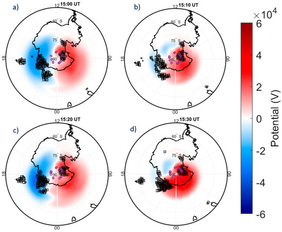 Polar-view maps in AACGM latitude and MLT of SuperDARN observations at 15:00 UT (a), 15:10 UT (b), 15:20 UT (c) and 15:30 UT (d) on 8 September 2017. Each map shows the isocontours of the ionospheric potential (red = positive, blue = negative potential) and the location of SuperDARN measurements (black squares) recorded in the two minutes following the time shown at the top of each map. In each map the projection to 350 km of altitude of all the σφ values having elevation angle α = 30° (purple circles), recorded by the GNSS receiver at Concordia in the same time interval as for SuperDARN observations are also shown. In each map, which covers 00:00–24:00 MLT and |50°|–|90°| AACGM Lat, the magnetic noon/midnight is at the top/bottom.