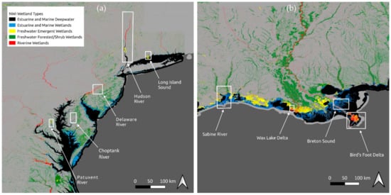 Blue carbon ecosystems such as tidal marshes, mangroves, and seagrass meadows, are among the most productive ecosystems on the planet and far surpass all other ecosystems in carbon sequestration on a per-area basis [1,2,3]. Global mangrove distributions have been effectively mapped, and recently updated, with efforts like the Global Mangrove Watch (GMW) [4,5]. However, recently updated and temporally and spatially harmonized estimates of tidal marsh extent remain poor [6,7]. Further, very few research efforts have attempted to assess marsh vegetation characteristics over large scales, in spite of the important role that marsh vegetation plays in trapping sediments, contributing organic matter to soil carbon stocks, and attenuating flood pulses [8,9]. In this study, we characterized tidal marsh extent and vegetation characteristics for the Mid-Atlantic Coast and Gulf of Mexico (Gulf Coast) of the United States, two regions with a high prevalence of coastal wetlands and high wetland productivity [10]. In addition to mapping wetlands that include marshes and swamps, we also mapped associated deepwater habitats including open water and aquatic beds. We focused our vegetation assessment on the identification of persistent vegetation and non-persistent emergent vegetation in tidal marshes. Persistent vegetation maintains significant biomass outside of the growing season while non-persistent vegetation loses the majority of its biomass outside of the growing season due to physical degradation and decomposition.