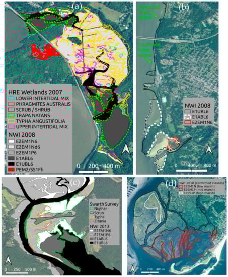 Intensive study sites with final wetland vegetation inventory datasets; Constitution Marsh (a), Beacon Bridge wetlands (not an official name) (b), Wheeler Marsh (c), and Jug Bay (d). Wheeler Marsh ground-confirmed classes are shown in legend parentheses. Note there are several cases where NWI classifications do not match more detailed wetland inventories or ground surveys. Detailed descriptions of NWI wetlands codes are provided in Table 1.