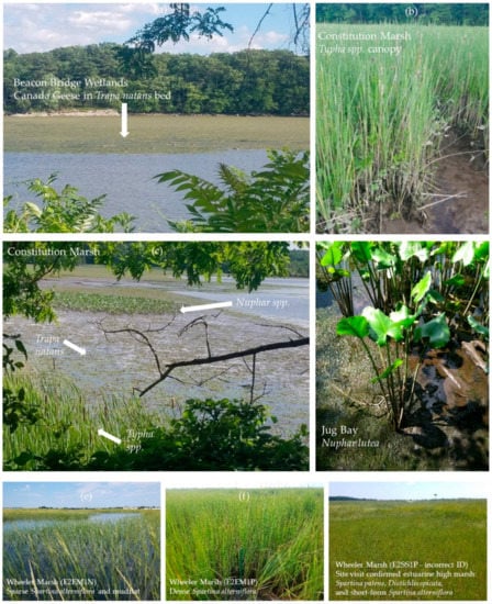 Site photo examples of wetland vegetation for the Beacon Bridge wetlands (a), Constitution Marsh (b,c), Jug Bay (d), and Wheeler Marsh (e–g). Note in many of the photos connected surface waters and aquatic beds are shown adjacent to wetlands. Constitution Marsh presents a clear demonstration of the fine elevation gradients that zonate moderate elevation marsh wetland vegetation like Typha spp. from low elevation marsh wetland vegetation like Nuphar spp. from floating aquatic deepwater vegetation like T. natans. Wheeler Marsh shows a common zonation of persistent vegetation for an Atlantic U.S. brackish tidal marsh complex. While the NWI E2EM1N and E2EM1P classes are roughly correct for Wheeler Marsh, the E2SS1P class in panel g is most accurately classified as the E2EM1P class for estuarine emergent high marsh. Note that these photos correspond to the intensive study sites in Figure 2.