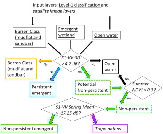 We used the Sentinel-1 time-series assessment (with results shown in Section 3.1 and Section 3.2) to derive a level-2 decision tree classification scheme based on empirically demonstrated differences between vegetation classes. For all vegetated classes, a summer median NDVI > 0.3 was used as this has been demonstrated as an effective threshold for identifying minimally vegetated regions [77]. We then developed a rule to split persistent and non-persistent vegetation based on applying a threshold of 4.7 dB to Sentinel-1 annual SD imagery which was demonstrated to completely separate persistent and non-persistent vegetation types (see Results Section 3.2). Last, we separated non-persistent emergent vegetation from T. natans by applying a −17.25 dB threshold to Sentinel-1 spring VV imagery. Use of the Sentinel-1 annual SD imagery in separating persistent and non-persistent vegetation was demonstrated in Lamb et al. (2019). The use of the Sentinel-1 spring VV image threshold is a new approach that is justified by the fact that T. natans may not develop significant above-water structures resulting from leaf elongation until July [82], while non-persistent emergent species generally develop such structures in May [11,72]. The justification for applying this threshold and others is further demonstrated in the time-series analysis in Results Section 3.1. The full description of level-2 classification scheme is provided in Figure 5 which includes details on how the level-1 classification is used as an input to the level-2 classification.
