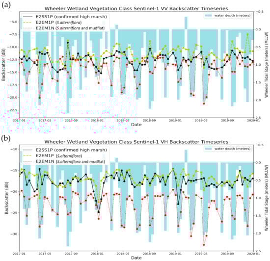 Wheeler wetland vegetation class Sentinel-1 VV and VH polarized backscatter time-series from 2017–2019 in (panels (a) and (b), respectively). Dates are shown in numeric year-month format. Water depth (in meters) is the NOAA tide gauge at Bridgeport (ID: 8467150) calibrated to in-marsh water level changes observed with Onset HOBO sensors from August 2018 to December 2018. Calibrations include time and water depth adjustments. E2EM1N (red dotted series) represents a low elevation portion of the wetland complex with sparse S. alterniflora and mudflat backscatter series. E2EM1P (gold dashed series) represents middle elevation marsh with dense S. alterniflora. E2SS1P (black series) is a high marsh dominated by Spartina patens, Distichlis spicata, and short-form S. alterniflora. For both E2EM1P and E2SS1P, some P. australis is present along wetland–open water and wetland–upland edges.