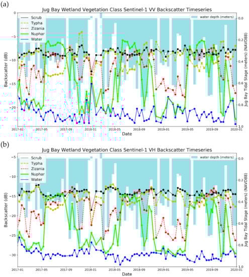 Jug Bay wetland vegetation class Sentinel-1 VV and VH polarized backscatter time-series from 2017–2019 (panels (a) and (b), respectively). Dates are shown in numeric year-month format. Water depth (in meters) is the NOAA tide gauge at Solomon’s Island (ID: 8577330) calibrated to in-marsh water level changes observed with Onset HOBO sensors from October 2019 to December 2019. Calibrations include time and water depth adjustments. All series represent spatial mean backscatter from Jug Bay wetland classes originally published in Swarth et al. (2013) and updated in Lamb et al. (2019). The wetlands classes are as follows: solid black series = shrub-scrub, dashed gold series = Typha spp., red dashed series = Zizania aquatica, solid green series = Nuphar lutea, solid blue = open water.
