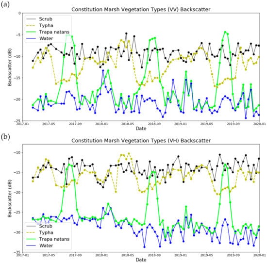Constitution Marsh Sentinel-1 VV and VH polarized backscatter time-series from 2017–2019 (panels (a) and (b), respectively). Dates are shown in numeric year-month format. The wetlands and deepwater classes are as follows: solid black series = shrub-scrub, dashed gold series = Typha spp., solid green series = Trapa natans, solid blue = open water.