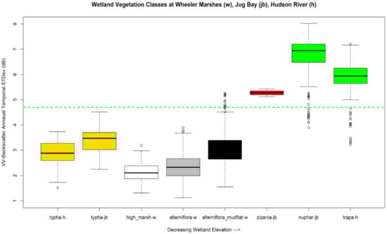 2017 Sentinel-1 VV annual standard deviation (VV-SD) pixel values by wetland vegetation class at Wheeler Marshes (w), Jug Bay (jb), and Hudson River (h) sites. For box labels, the first term represents wetland vegetation type and the second term is the location (e.g., “typha-h” is Typha spp. from Constitution Marsh in the Hudson River). All boxes represent VV-SD extraction for the wetland vegetation boundaries/polygons shown in Figure 2 that were also used for time-series spatial mean backscatter computation in Figure 6, Figure 7 and Figure 8. Note that colors also correspond to vegetation type in Figure 6, Figure 7 and Figure 8, except for Wheeler Marsh where grayscale box colors represent elevation gradient. Note threshold of 4.7 dB threshold separates persistent and non-persistent vegetation (horizontal dashed green line).
