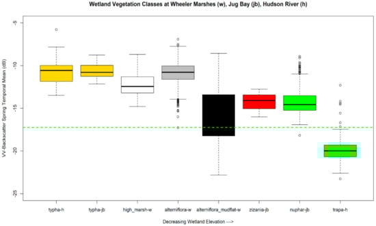 2017 Sentinel-1 VV spring mean backscatter pixel values by wetland vegetation class at Wheeler Marshes (w), Jug Bay (jb), and Hudson River (h) sites. Naming convention, color schemes, and areas of extraction are the same as in Figure 9. Note with the VV spring layer, a threshold of −17.25 dB separates T. natans from other non-persistent vegetation (horizontal dashed green line).