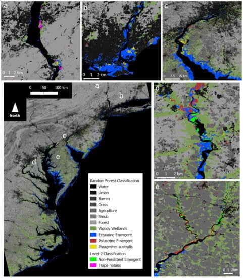 Mid-Atlantic level-1 classification using random forest. Panels a–e depict finer scale maps of the Hudson River wetlands (a), Housatonic River wetlands (b), Delaware River wetlands (c), Patuxent River wetlands (d), and Choptank River wetlands (e). The three separate emergent wetland classes are mapped with greater than 81% accuracy in all cases (see Table 2 confusion matrix). A clumped emergent wetland class (estuarine emergent, palustrine emergent, and P. australis) was mapped with a user’s accuracy of 89.69% and producer’s accuracy of 93.19%.
