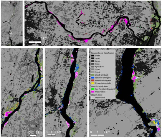 Comparison between Hudson River classified T. natans extents in level-2 classification and independent validation with 2018 HRSAV dataset. The small panned map in the upper left corner shows the Hudson River and locations of panels (a–d). Panel a showcases classified T. natans extent in the Mohawk River, a tributary to the Hudson River; note that the HRSAV dataset does not cover this site. T. natans occurrence accuracy was 96.47%.