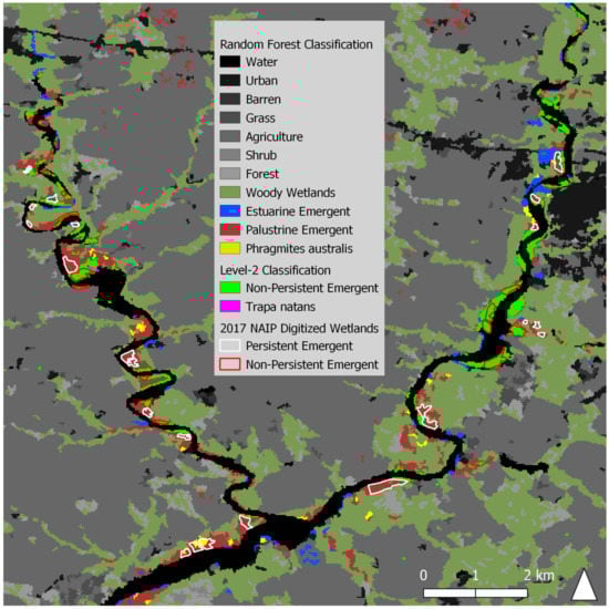 An independent evaluation dataset derived from manual digitization of 2017 summer National Aerial Imagery Program (NAIP) imagery [84] was used to evaluate level-1 and level-2 classification performance in mapping emergent wetlands in the Choptank River. The boundaries of persistent and non-persistent vegetation were digitized based on the NAIP imagery and results were compared to level-1 and level-2 classifications. Given that our digitization process was similar to that of the HRSAV dataset, minimum mapping units can be expected to be of a similar order.