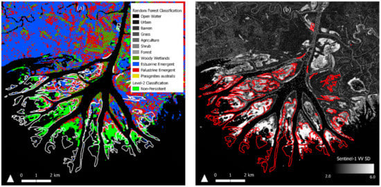 RF-based wetland classifications are most commonly performed on a per-pixel basis [41,42,70,71]. Recently, Mahdianpari et al. (2019) found increases in wetland classification accuracy by using an object-based RF classifier [43]. However, the per-pixel RF classification approach has several advantages relevant to our study, the foremost of which is the computational efficiency of per-pixel classifications. This is an important consideration in assessing the feasibility of large-scale mapping efforts. Further, the per-pixel RF classification scheme provides readily interpretable pixel-level agreement assessments between the wetlands–deepwater RF classification (level-1) and structural and phenological identification of vegetation using time-series SAR by isolating temporal variability for a given pixel, rather than assessing combined spatial and temporal variability over two separate classification schemes.