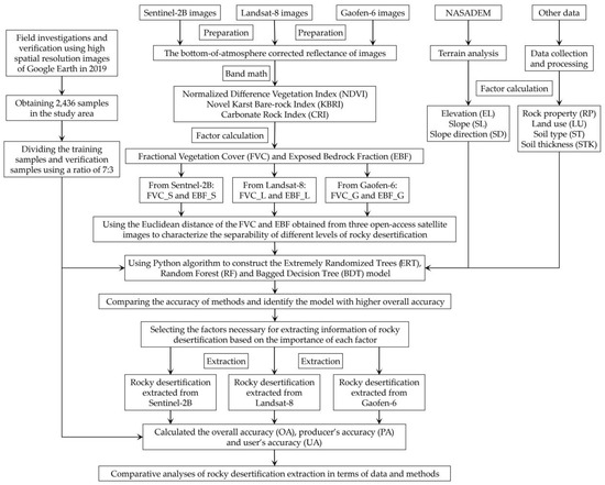 First, after downloading and pre-processing remotely sensed data and ancillary data, we calculated the factors required for information extraction of rocky desertification. Then, we compared the separability of the fractional vegetation cover (FVC) and exposed bedrock fraction (EBF) obtained by three types of images (Sentinel-2B, Landsat-8, and Gaofen-6) on distinguishing rocky desertification by Euclidean distance. Finally, we built ERT, RF, and BDT models through the Python programming language and selected the best model based on their performance in extracting rocky desertification from the three types of images. The methodology flowchart is shown in Figure 2, and some major components of the flowchart are described in the following sections.